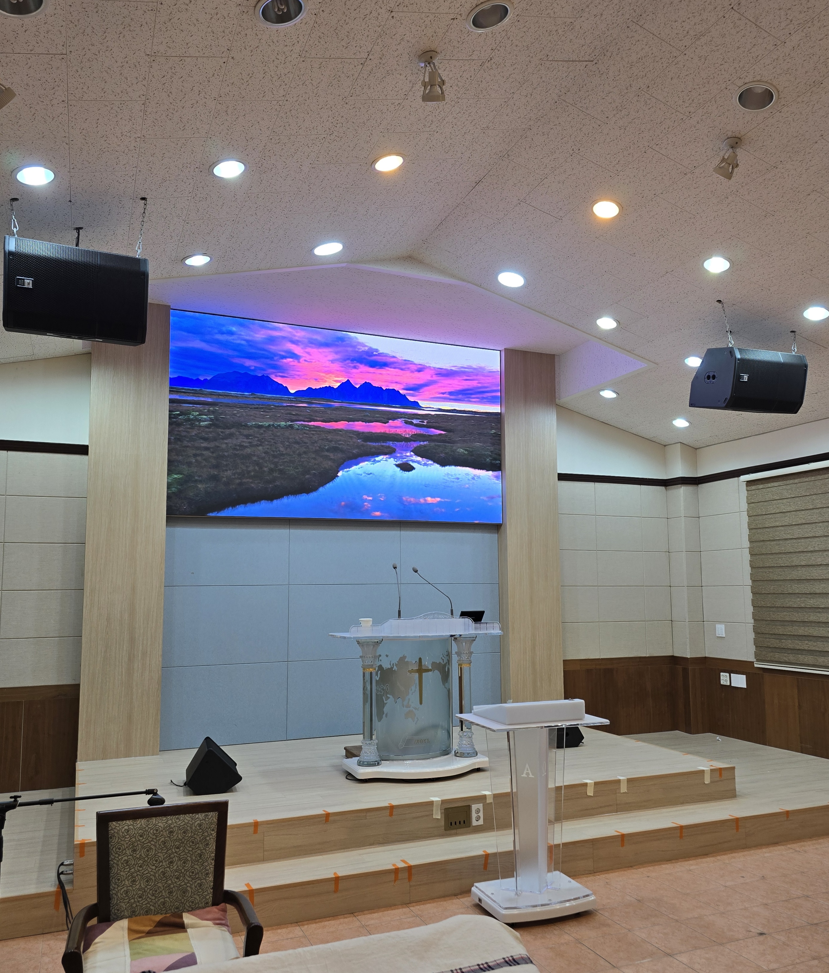 위치 선정과 수평 조절을 진행했으며, 예배 환경에 최적화된 화면 밝기와 컬러 밸런스를 세팅해